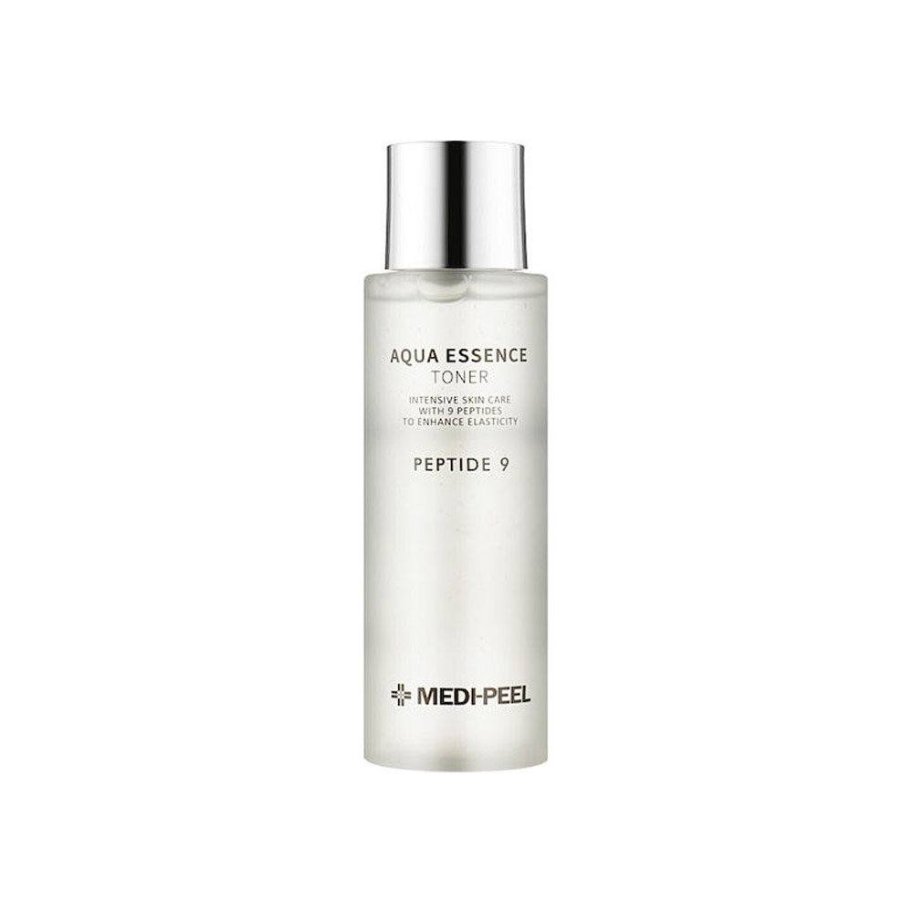 Medi-Peel Peptide 9 Aqua Essence Toner 250 ml Ένα εξειδικευμένο αντιγηραντικό toner-essence, εμπλουτισμένο με 9 πεπτίδια, Volufiline™, υαλουρονικά, υδρολυμένο κολλαγόνο, astaxanthin — σχεδιασμένο για άμεση ενυδάτωση, σύσφιξη του δέρματος, λείανση ρυτίδων και αποκατάσταση λάμψης.
